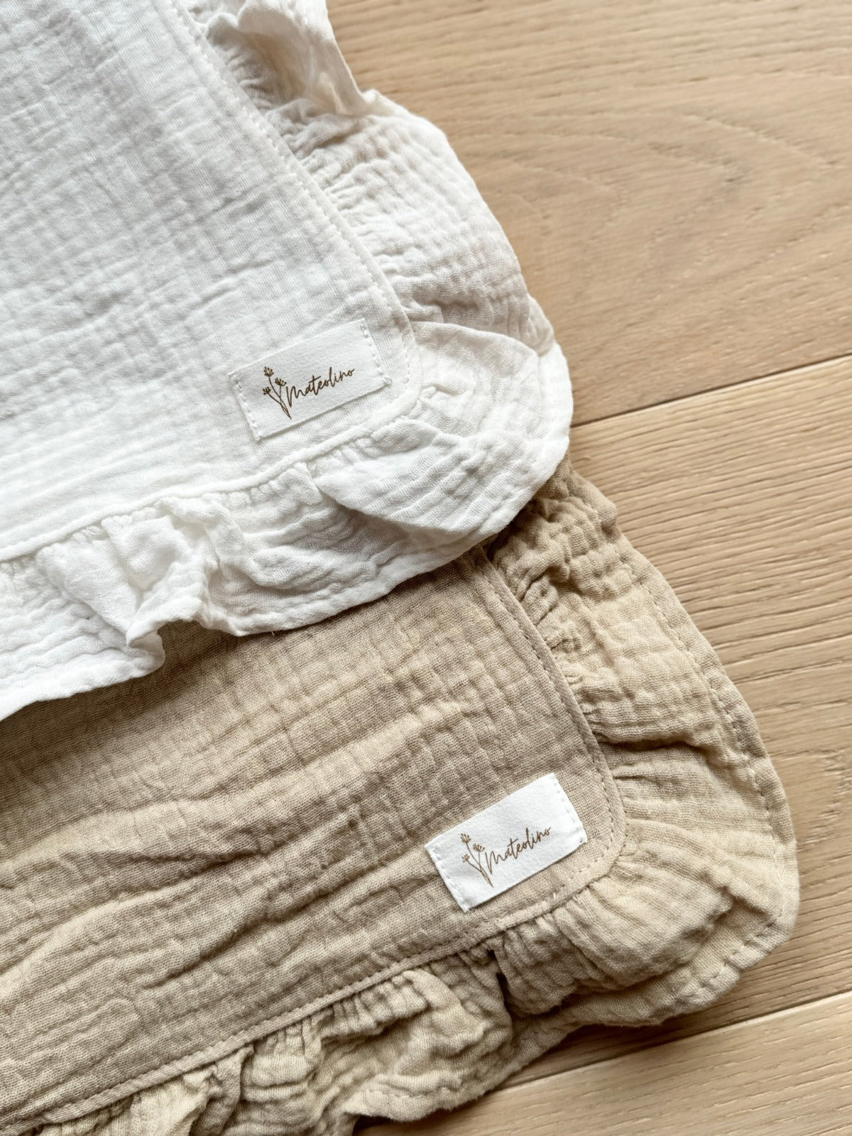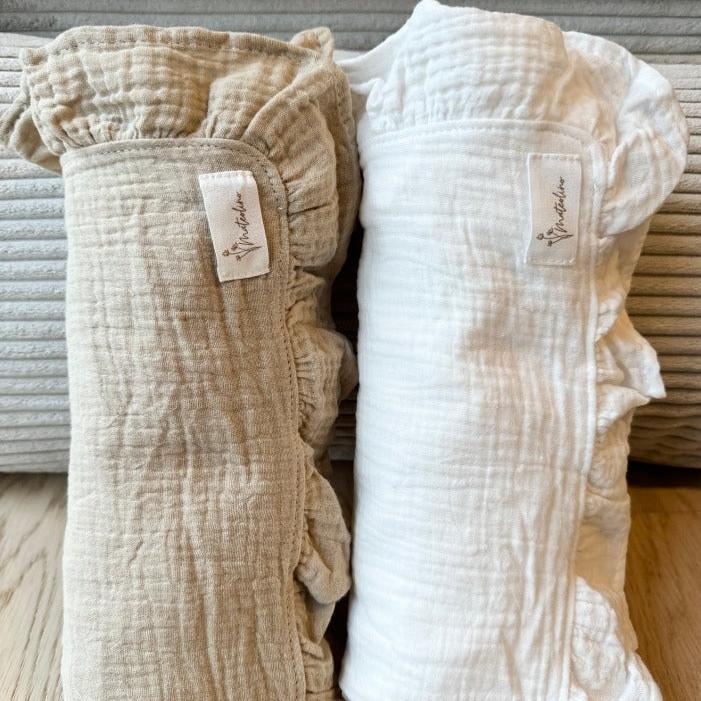 Kuschelweiche Deluxe Musselintücher mit Rüschen aus 100% Baumwolle für Babys. Ideal als Stilltuch, zum Pucken, Unterlage oder Schmusetuch. Extra weich und atmungsaktiv für Babys zarte Haut.